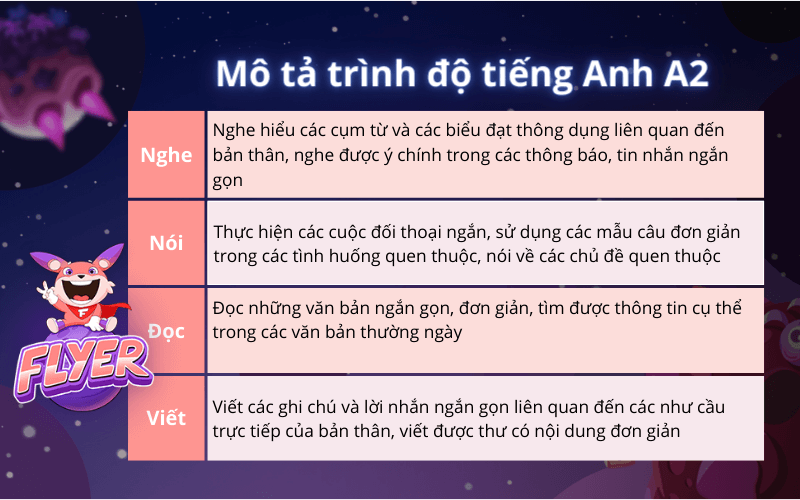 Đạt trình độ A2 đồng nghĩa với việc bạn hoàn thành việc xây dựng nền tảng kiến thức tiếng Anh căn bản vững vàng. Mặc dù trình độ A2 đã đủ cho các giao tiếp căn bản hàng ngày, bạn có thể khó tránh được các lỗi cấu trúc khi cố gắng diễn đạt trọn vẹn ý và gặp khó khăn khi nghe, đọc các văn bản có số lượng từ vựng lớn.