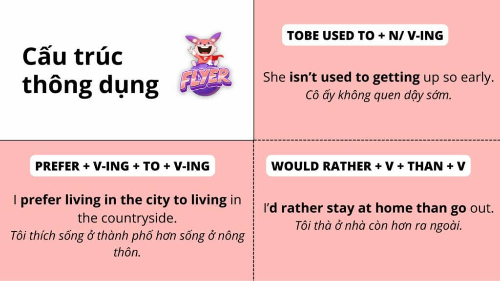 tobe used to something/ doing something | quen với cái gì/ quen làm gì đó | She isn’t used to getting up so early. Cô ấy không quen dậy sớm. We’re not used to the noise. Chúng tôi không quen với tiếng ồn. |