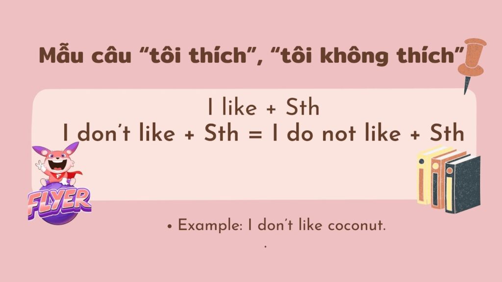 Ngoài ra, ta có mẫu câu “tôi không thích” đối lập hoàn toàn với “tôi thích” như sau: