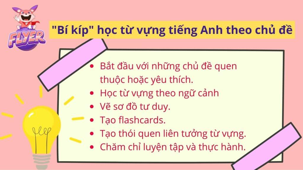 Học từ vựng tiếng Anh theo chủ đề là một trong những phương pháp học từ vựng hiệu quả và phổ biến nhất hiện nay. Tuy nhiên, để đạt hiệu quả tối ưu, bạn không thể “cứ thế học bừa” mà cần áp dụng phương pháp này đúng cách. FLYER xin gợi ý cho bạn một số bí kíp học từ vựng tiếng Anh theo chủ đề sau đây: