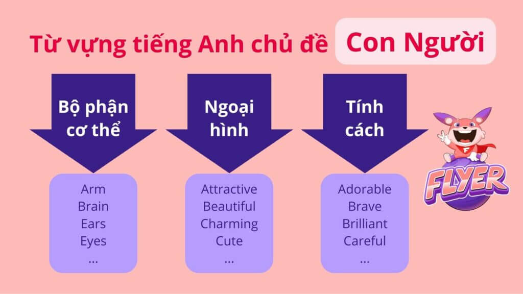 Con người là chủ đề từ vựng cơ bản và là một trong những bài học đầu tiên của bất kỳ người học tiếng Anh nào. Vậy, từ vựng tiếng Anh của các bộ phận trên cơ thể người là gì? Bạn có còn nhớ những từ tiếng Anh nào dùng để nói về ngoại hình và tính cách của một người không? Hãy cùng FLYER ôn lại những từ đã học và học thêm từ mới (nếu có) ngay sau đây: