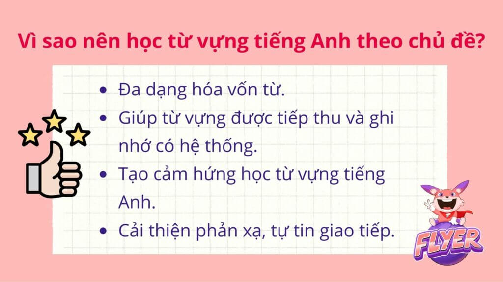 Trước khi bước vào nội dung chính của bài học, bạn hãy cùng FLYER tìm hiểu nhanh một vài lợi ích của việc học từ vựng tiếng Anh theo chủ đề ngay sau đây. Cụ thể, phương pháp này: