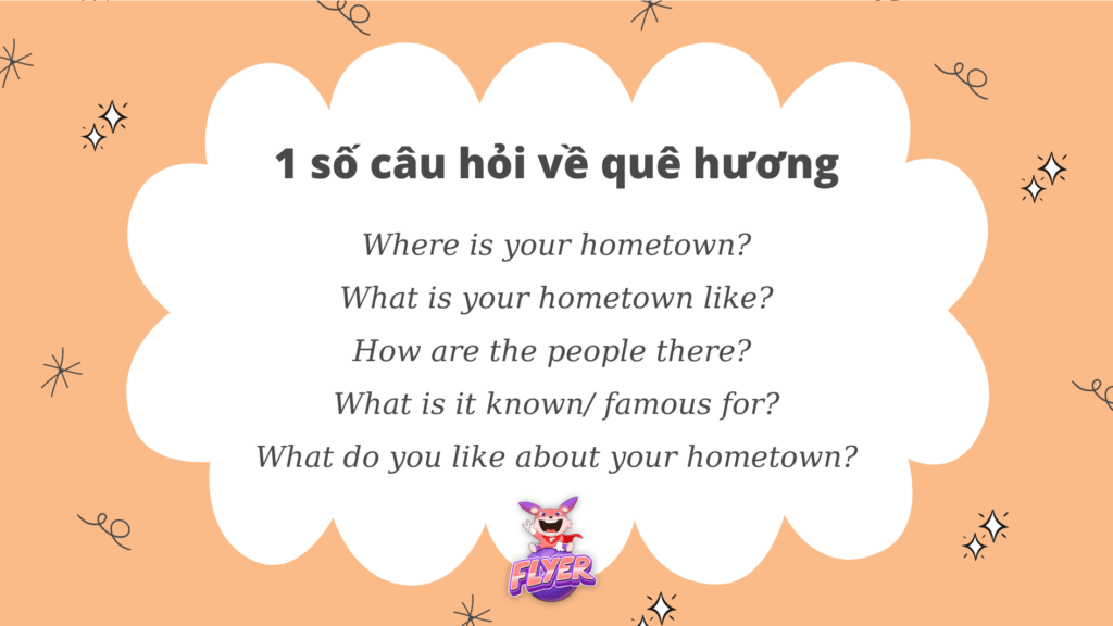 Có một vài chủ đề nhất định để giới thiệu về quê hương. Dưới đây, FLYER đưa ra một số câu hỏi thường gặp và gợi ý nhiều cách trả lời khác nhau. Các bạn hãy kết hợp mắt và miệng để vừa quan sát và đọc to các mẫu câu lên nhé. Việc này sẽ giúp bạn phát âm hay và tự nhiên hơn.
