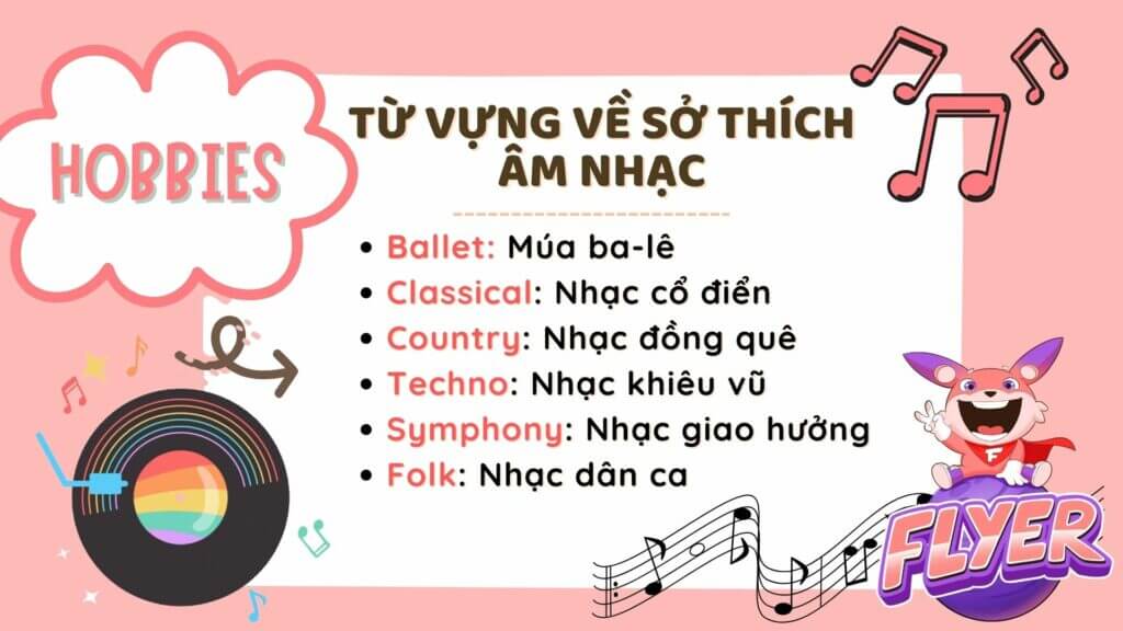 Âm nhạc là sở thích của rất nhiều bạn, vì vậy mà việc hiểu biết các từ vựng về âm nhạc sẽ giúp bạn tìm được điểm chung khi giao tiếp với bạn bè. Hãy cùng điểm qua các từ vựng này để áp dụng vào viết đoạn văn về sở thích nào.