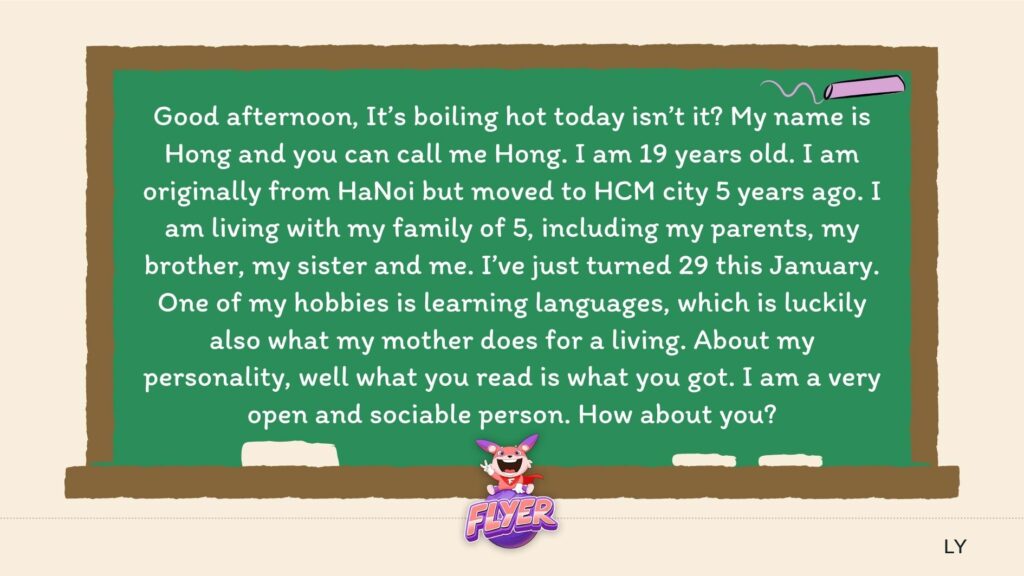 Chào buổi chiều, rất vui được gặp bạn. Hôm nay trời nóng quá phải không? Tên tôi là Hồng và bạn có thể gọi tôi là Hồng. Tôi 29 tuổi. Tôi quê gốc ở Hà Nội nhưng đã chuyển vào sinh sống tại TP HCM cách đây 5 năm. Tôi đang sống với gia đình 5 người, bao gồm bố mẹ tôi, anh trai tôi, chị gái tôi và tôi. Tôi vừa tròn 19 tuổi vào tháng Giêng này. Một trong những sở thích của tôi là học ngôn ngữ, may mắn là đây cũng là công việc mà mẹ tôi làm để kiếm sống. Về tính cách của tôi, như những gì bạn đọc đó. Tôi là một người rất cởi mở và hòa đồng. Còn bạn thì sao?