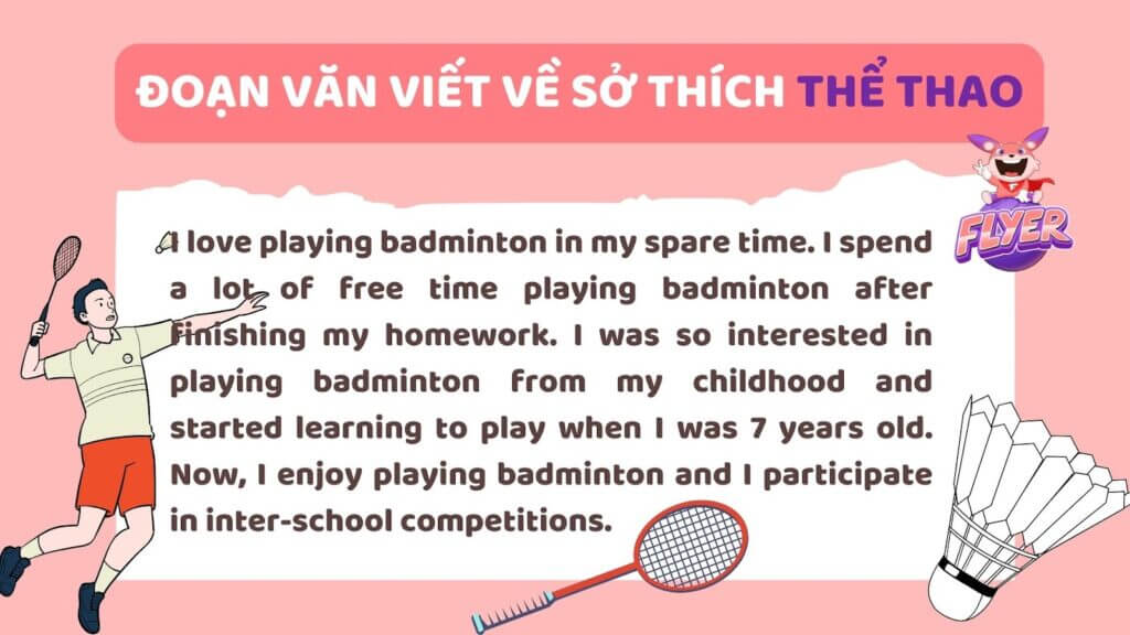 Sở thích của mình là chơi cầu lông vào thời gian rảnh. Mình dành thời gian rảnh để chơi cầu lông sau khi hoàn thành bài tập về nhà. Mình đã rất hứng thú với việc chơi cầu lông từ khi còn rất nhỏ và bắt đầu học cách chơi vào lúc 7 tuổi. Khi mình được 8 tuổi, bố mình nói với cô giáo về sở thích cầu lông của mình. Cô giáo bảo rằng có 1 nhà thể thao mở cửa hàng ngày ở trường vì vậy ba có thể cho mình tham gia. Bây giờ, mình thật sự thích chơi cầu lông và tham gia vào các giải đấu liên trường.