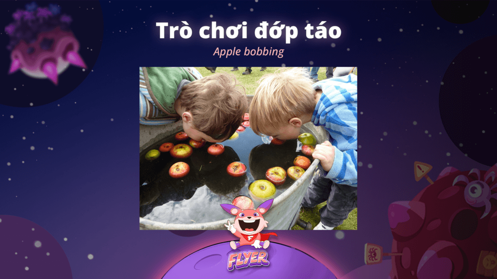 - Trò chơi đớp táo (apple bobbing): Quả táo sẽ được để vào 1 chậu nước hay buộc lên cao. Sau đó, ai cắn được trái táo nhanh nhất là người chiến thắng.