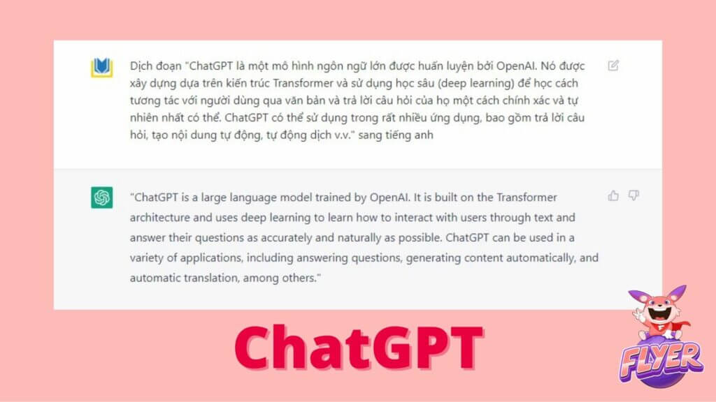 ChatGPT là một phần mềm siêu trí tuệ nhân tạo mới được ra mắt vào tháng 11/2022. Dù chỉ vừa ra mắt không bao lâu, ChatGPT đã nhanh chóng trở thành một trong những phần mềm nổi tiếng nhất thế giới, nhờ vào khả năng tương tác như người thật và có thể hỗ trợ nhiều lĩnh vực khác nhau, trong đó có dịch thuật.